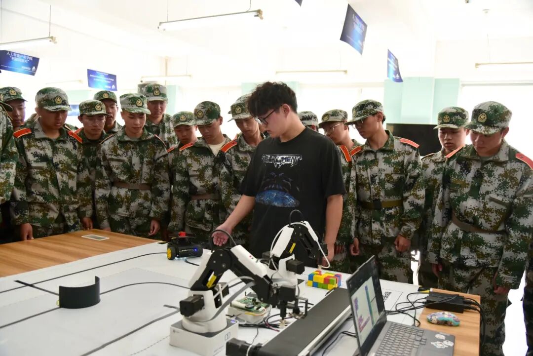 在参观过程中,员工干部们为新生系统讲解了机器人、智能小车、机械臂、机器狗等核心展品,重点介绍了公司在人工智能技术研发、教学实践及产业应用等方面取得的成果,并结合实际展品分享了专业学习的方法与未来发展方向。现场还安排了丰富的实操演示环节,通过机器人动作控制、智能小车循迹行驶、机械臂精准操作和机器狗运动展示等互动展示,让新生直观了解智能设备的运作原理和技术特点。新生们认真观摩各项演示,专注聆听讲解,对人工智能技术展现出浓厚的兴趣和高度的关注。