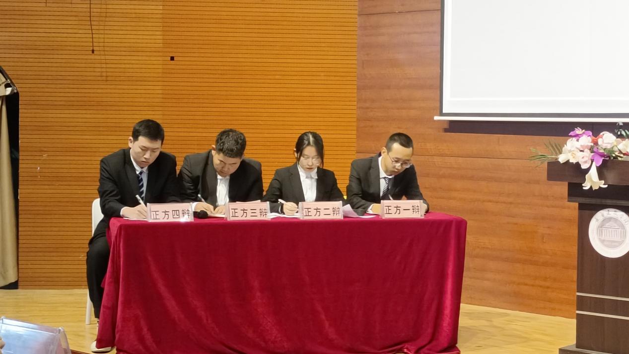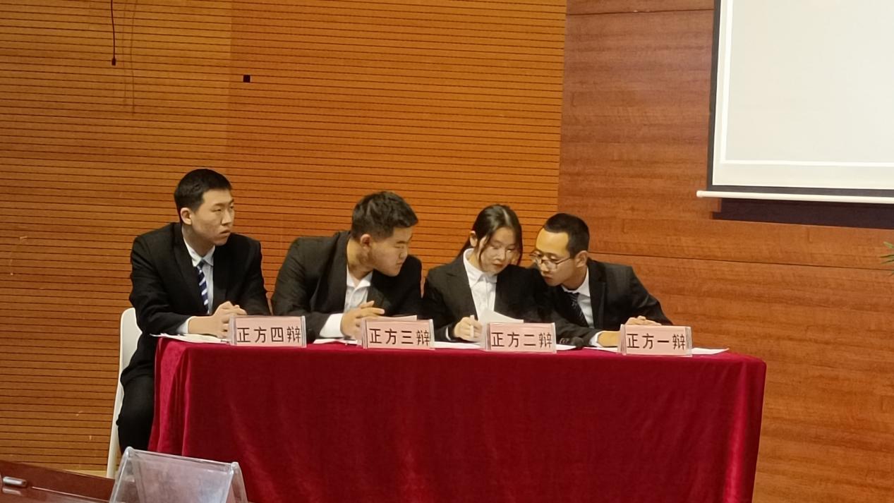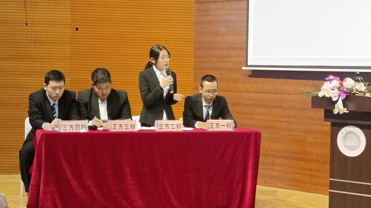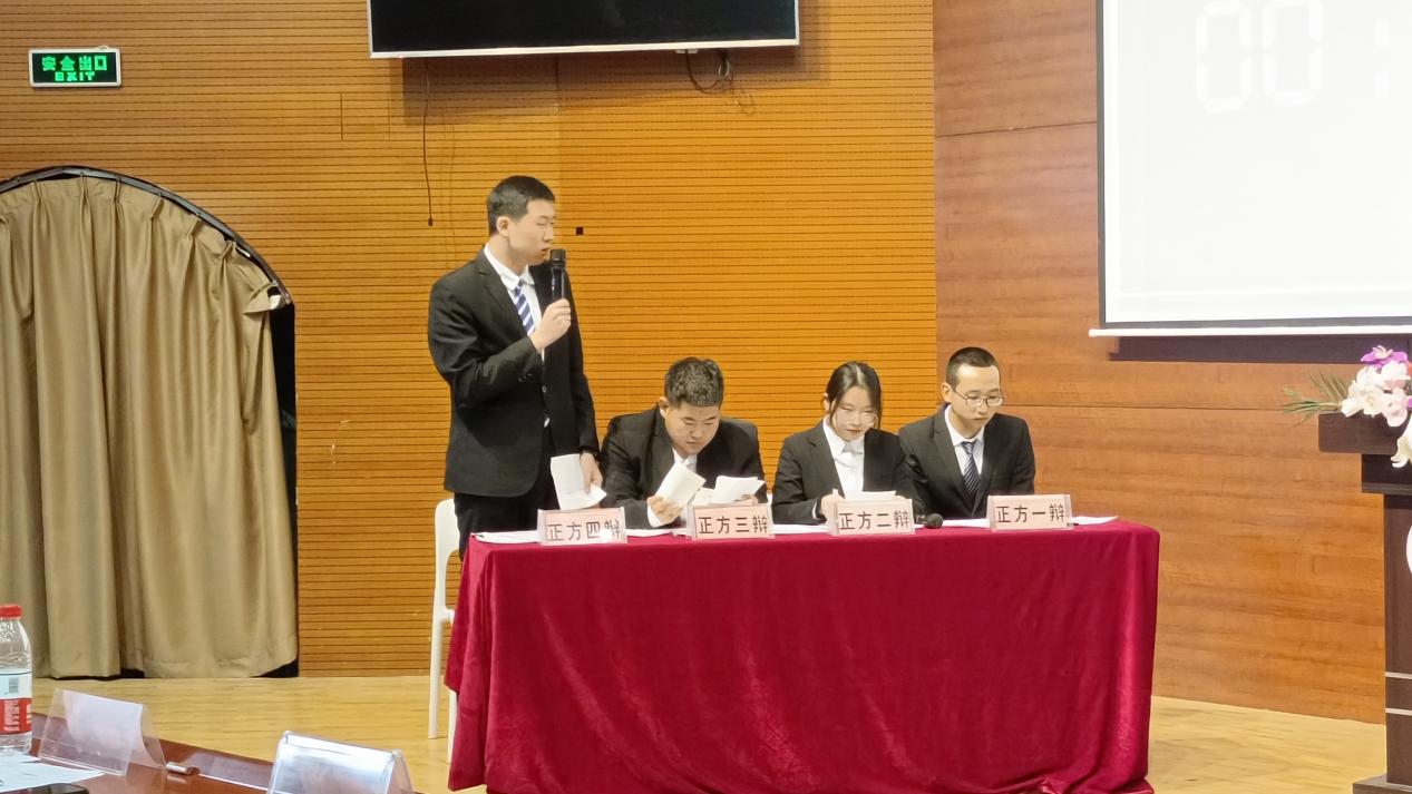 比赛开始,我方一辩张世腾开篇立论,明确了我方的三个论点,分别包括:我们在工作中可以积累一定的工作经验、考研失败的机率较大以及当今社会所需要的应用型的人才短缺。二辩曹鑫和三辩郭启建用充足的数据和示例,进一步巩固了我方观点,为自由辩论环节做了良好铺垫。