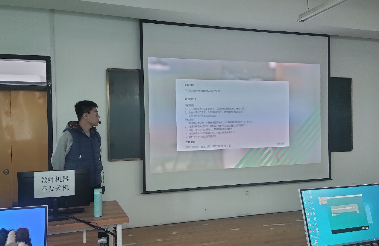 紧接着,郭老师引用会前同学们所搜寻到的当前热门企业单位关于计算机、大数据等相关专业方向的招聘条件,并逐一为大家解读。在谈到不同工作的性质、内容,以及对应聘者的要求时,郭老师引导大家根据自身情况对号入座,并判断自身的知识能力能否满足应聘条件,并找出能力欠缺部分。由此提醒同学们应该抓紧在校时间,明确学习目标,提升个人专业素质,努力规划未来的发展方向。