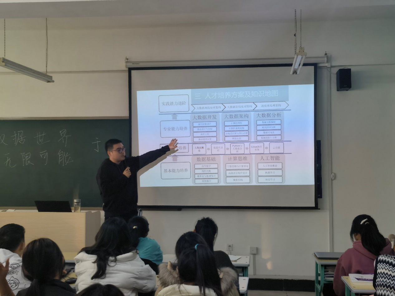 随后于老师就本专业为培养目标进行深刻指导与解析,具有德智体美劳全面发展的、具有良好数学基础和计算思维能力,系统掌握以人工智能和大数据的基本理论、方法与技能,接受科学研究的初步训练和应用能力训练,能应用所学技能解决工程中的实际问题,具有一定的创新能力和较高综合素质,未来可从事大数据架构、大数据开发、大数据分析等工作的应用复合型人才。与此同时,于老师鼓励同学们在学习之余积极参加科技文化类竞赛及文体活动,增强科创能力,积累实践经验,为将来的职业生涯选择打下坚实基础。