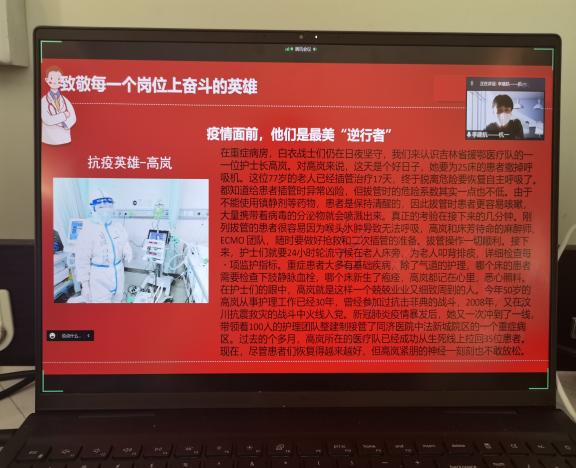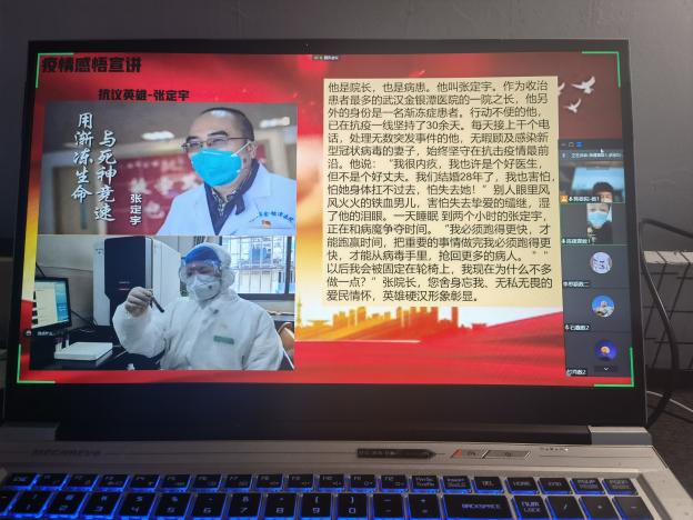首先,各班开展“口述疫情,并肩战役”的活动,各班分别由三名同学为大家讲述疫情期间志愿者们的故事。手上布满血痕的95后护士胡佩;两次出征抗疫的“高龄”护士蔡卫敏;支援吉林省的医护人员亲人去世了,她没有选择回家送终而是选择继续坚守岗位......同学们表示,在这个没有硝烟的战场上,志愿者们众志成城,并肩作战,他们舍小家,顾大家,在疫情如此严峻的情况下,我们能在公司,在寝室安心的上网课离不开这些逆行者的守护,没有逆行者负重前行,哪里会有我们的春暖花开。