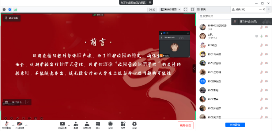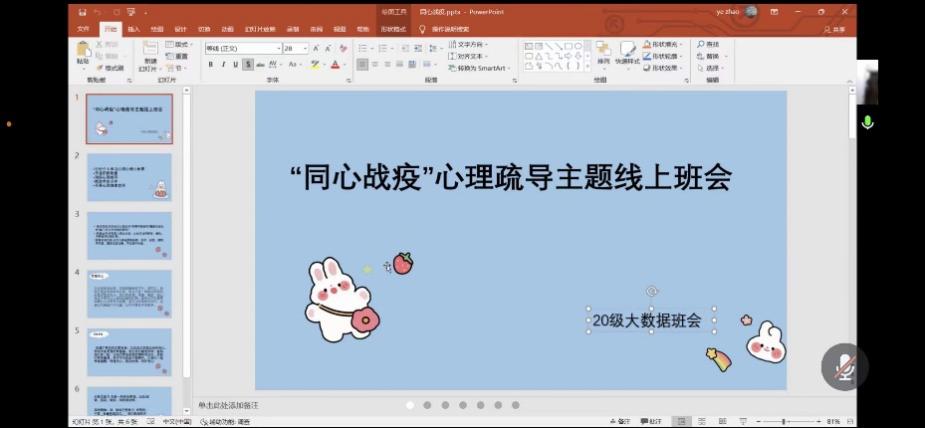 最后,各班心理委员向同学们讲到,疫情期间一定要注意防护,同时无论是在学习中还是日常生活中都要保持积极向上的心态,不要被疫情所压倒,而要抓紧时间充实自己,如果遇到任何困难随时可以同班长和辅导员联系,共同解决。