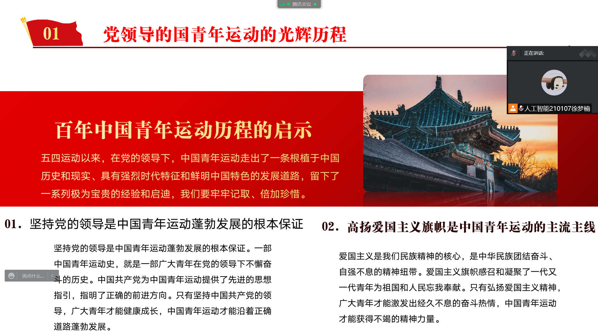 会议伊始,各班团支书带领同学们学习中国共产党领导的中国共产主义青年团开展的青年运动。五四运动以来,在党的领导下,中国青年运动走出了一条根植于中国历史和现实、具有强烈时代特征和鲜明中国特色的发展道路。同学们表示,爱国主义是我们民族精神的核心,而青年主体是中国青年运动的活力源泉。青年兴则国家兴,青年强则国家强,我们青年一代要以奋斗刷新青春的意涵,承载起国家和民族的光明未来。