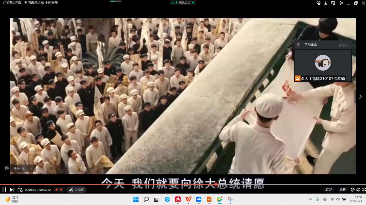 随后,各班团支书带领同学们观看《五四青年运动》短片。“外争国权,内惩国贼”“废除二十一条”“拒绝在和约上签字”一百年前的高校员工在面对北洋军阀残酷镇压的刀枪面前,喊出了如此豪壮的口号。光阴流逝,时代变迁,作为新时代青年的我们,要高举“五四”旗帜,追溯“五四”精神,现在我们应当把这种精神体现在学习上,在科技高速发展的21世纪,只有好好学习,才能为祖国的建立出一份力。