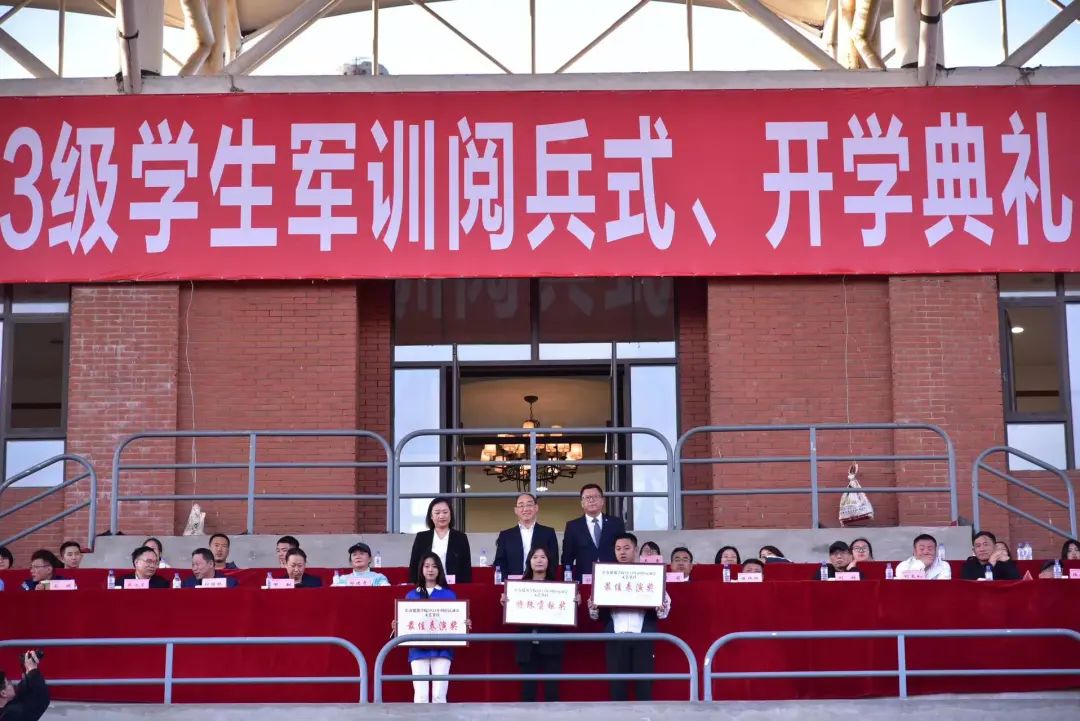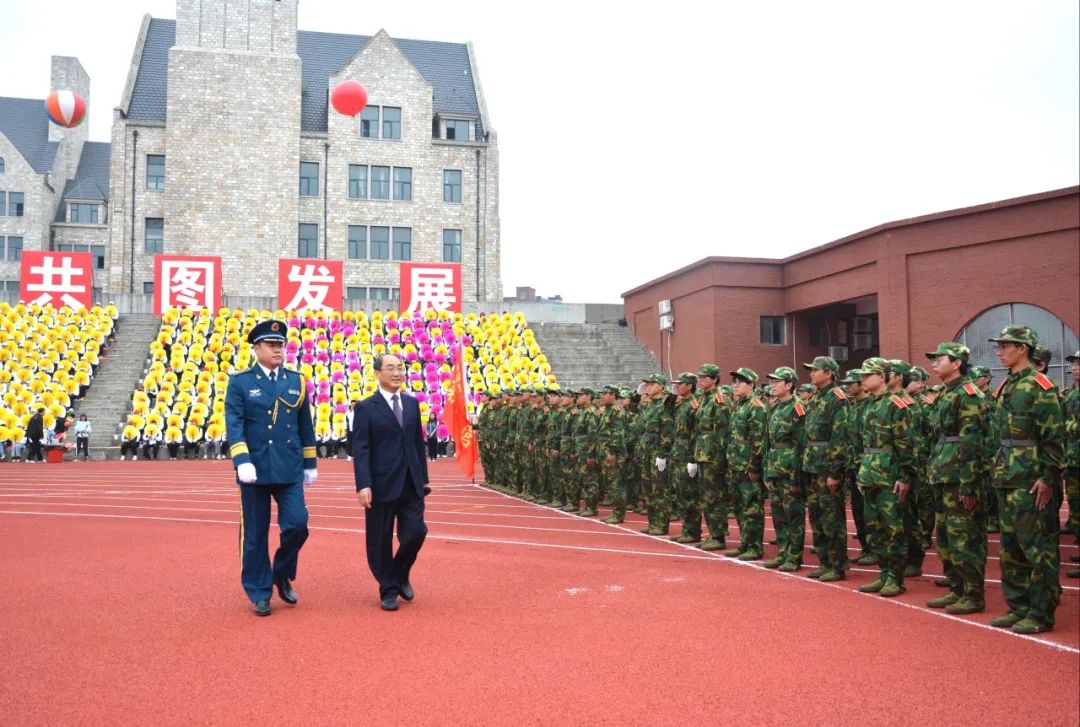 公司董事长任玉珊在国防聚志训练团团长王帅的陪同下检阅新生队伍,并向同学们提出亲切的问候。