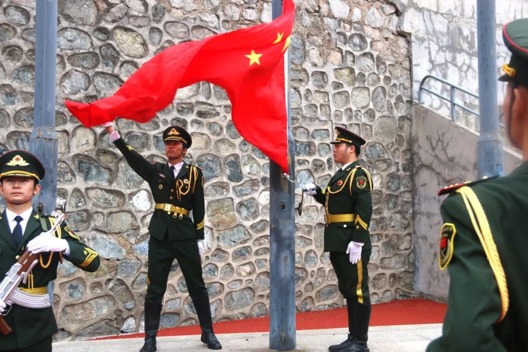 在慷慨激昂的歌声中,国旗护卫队身穿整齐的军装,手持国旗,肃穆地走进会场,在全场的注目下五星红旗冉冉升起,军训阅兵仪式就此拉开序幕。