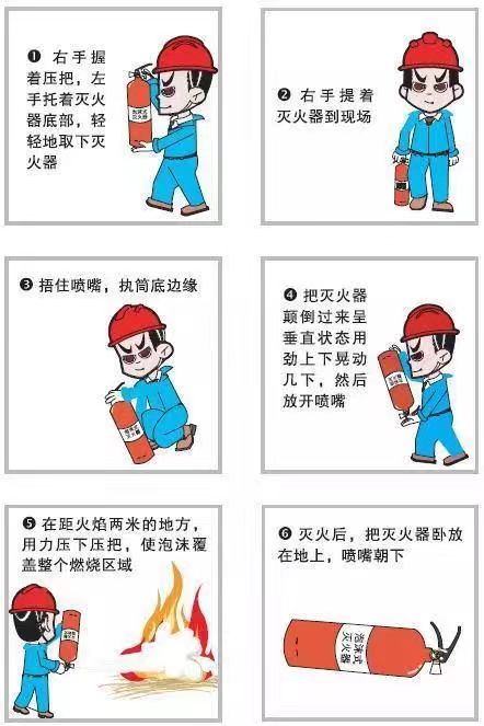 此外,不同类型的灭火器使用方法不同,比如泡沫灭火器使用前不可横拿或颠倒,以免药剂提前混合喷出;二氧化碳灭火器使用时,鸭嘴式的先拔掉保险销,压下压把即可,手轮式的先取掉铅封,再按逆时针方向旋转手轮,药剂即可喷出。