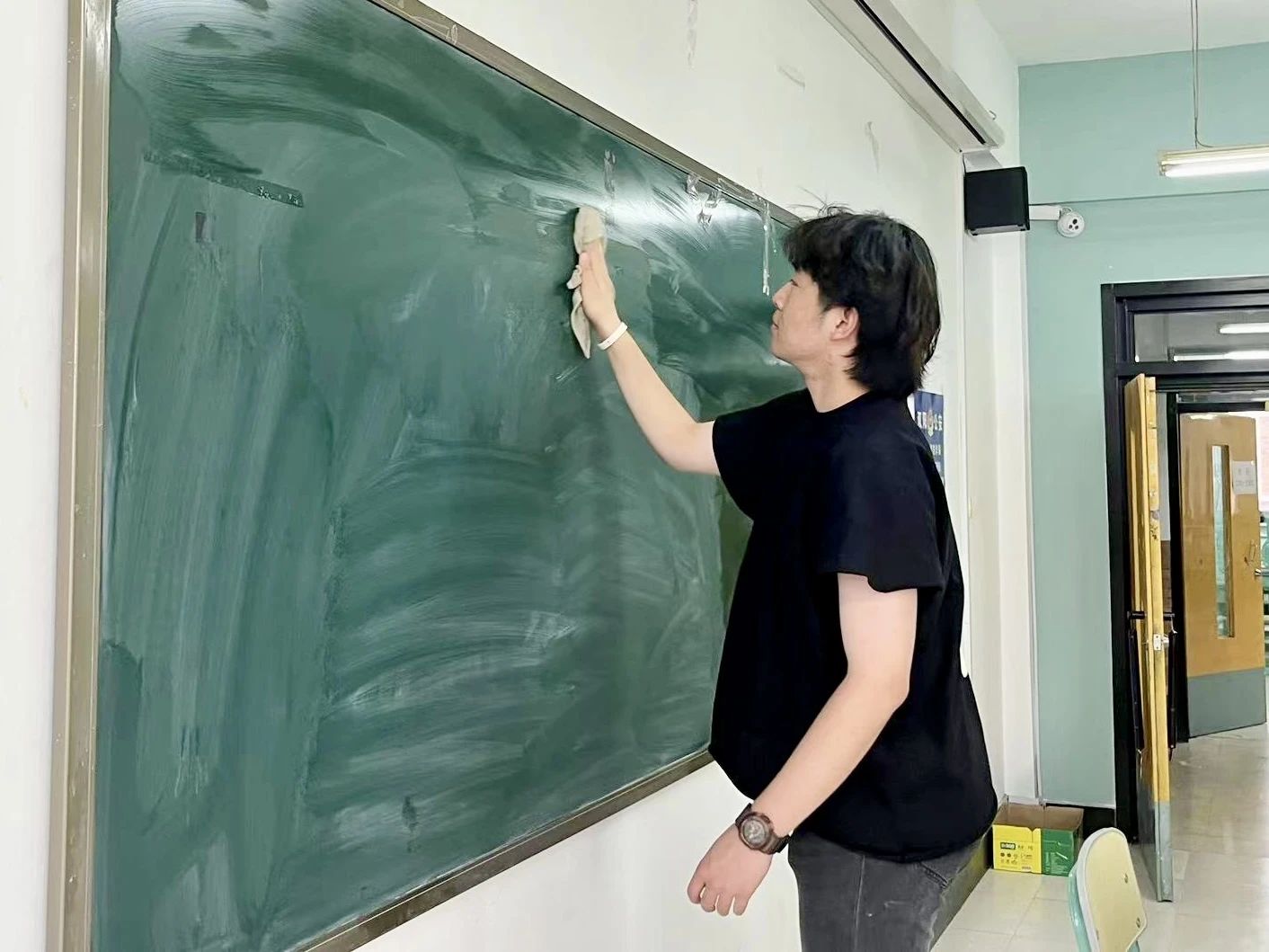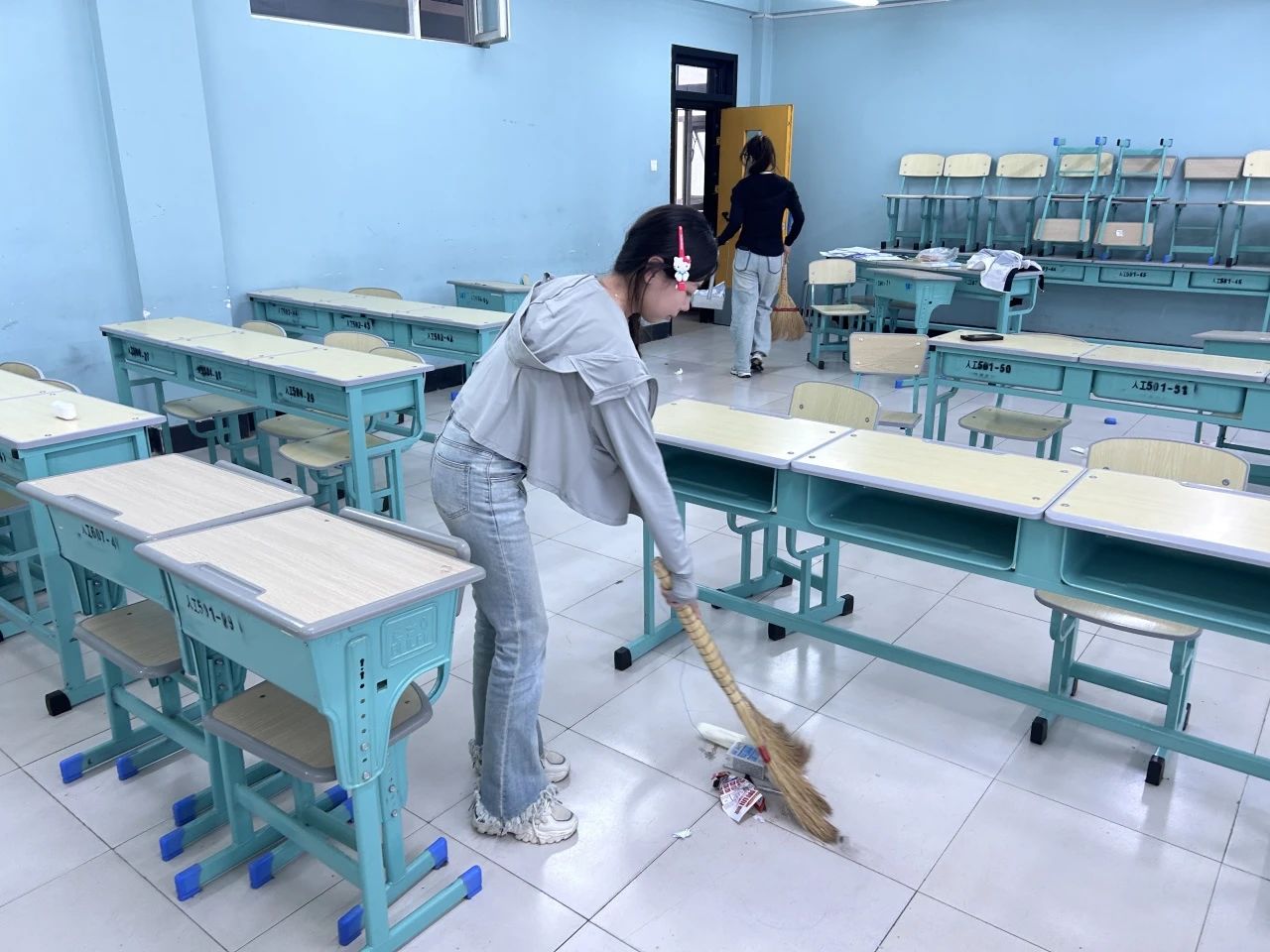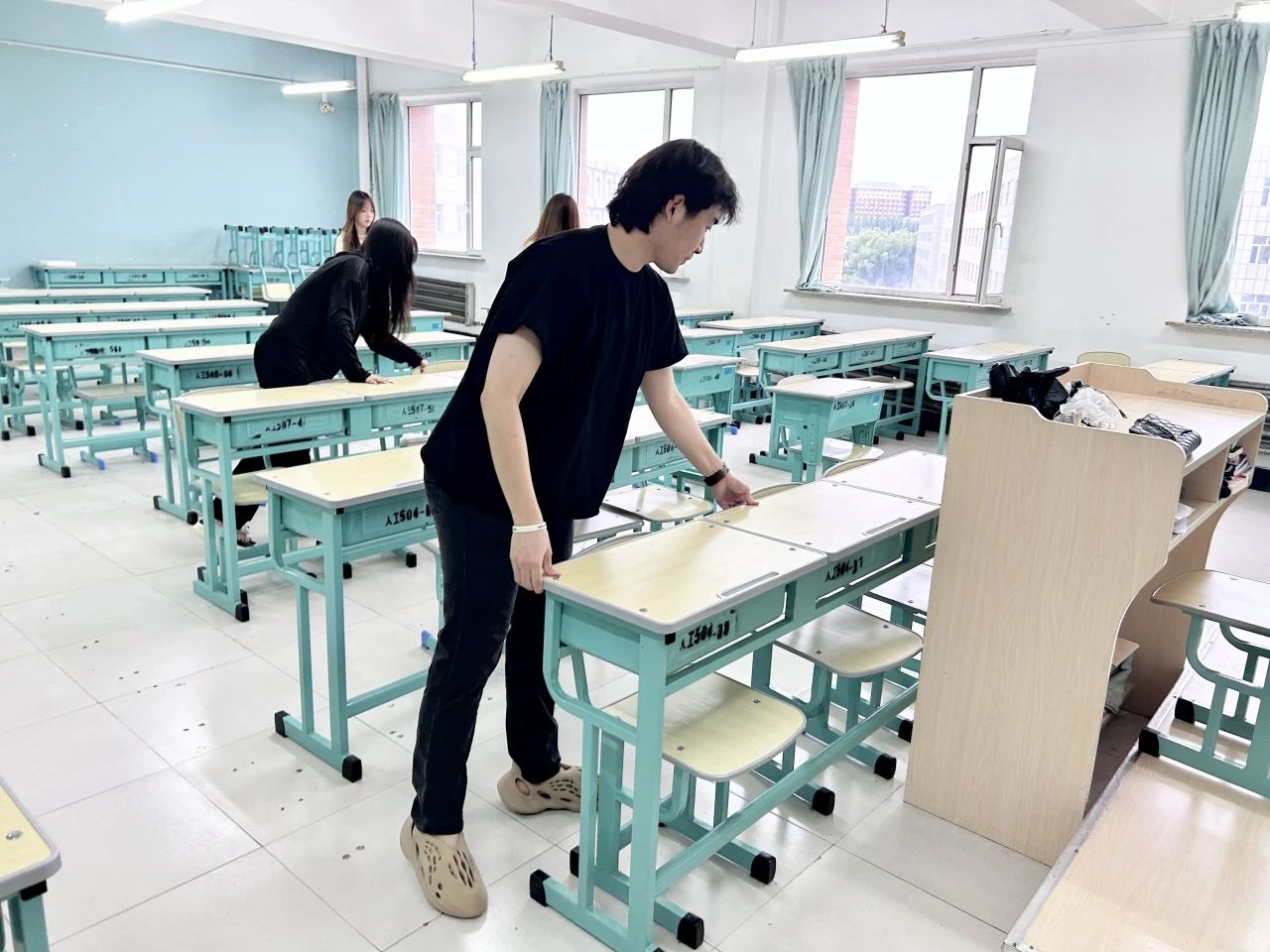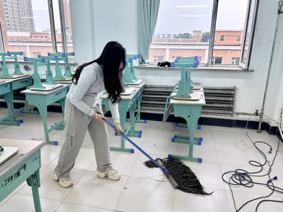 活动过程中,同学们从“心”开始,从“细”着手,将教室按照考场要求进行了整体的布置。他们满怀热情的拿着扫把、拖布等卫生工具,耐心地对每一套桌椅、每一个窗台、每一块黑板进行打扫,并将教室桌椅摆放有序,力求细致地完成卫生清扫和考场布置工作,给四、六级考生打造一个洁净舒适的考试环境。炎热的天气,抵挡不了同学们打扫教室的热情,经过同学们齐心协力的劳动,教室环境焕然一新
