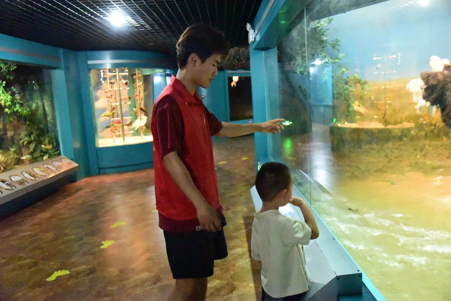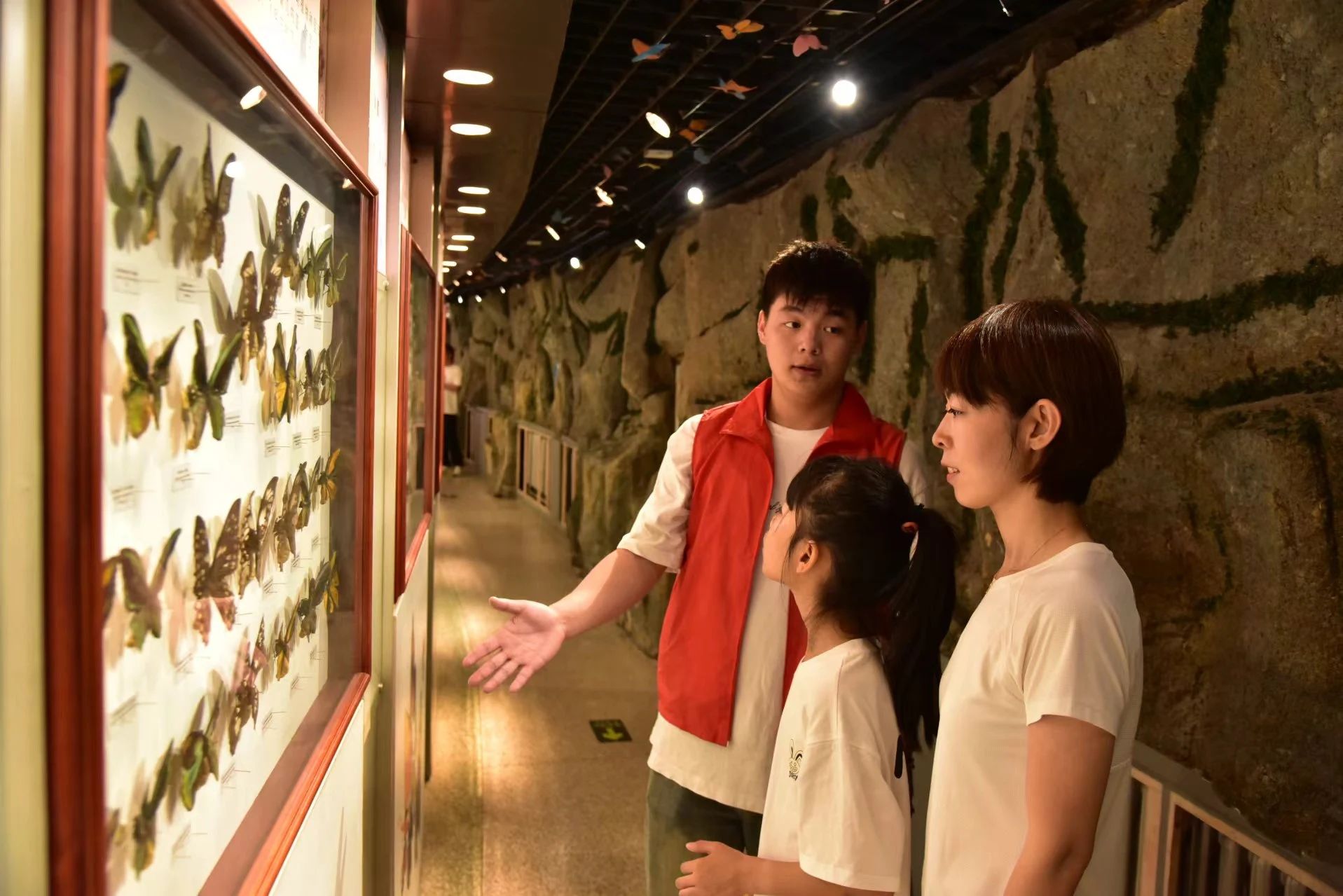 活动开始,志愿者们按照楼层顺序依次进行细致入微的导览讲解。展区包括形态各异的恐龙、线条流畅且色彩斑斓的蝴蝶、栩栩如生的鸟兽,以及四季变换的长白林海等,通过志愿者的深入讲解,小朋友们能够从远古生物的化石中,感受时间的沧桑与生命的演化奇迹;在丰富多样的动植物标本前,惊叹大自然的鬼斧神工和生物的多样性,仿佛身临其境。在这里,小朋友们可以近距离观察这些标本的形态、色泽和纹理,体会生命的多姿多彩。志愿者们以青春的活力和独特的视角,将这些珍贵的自然遗产呈现给小朋友们。