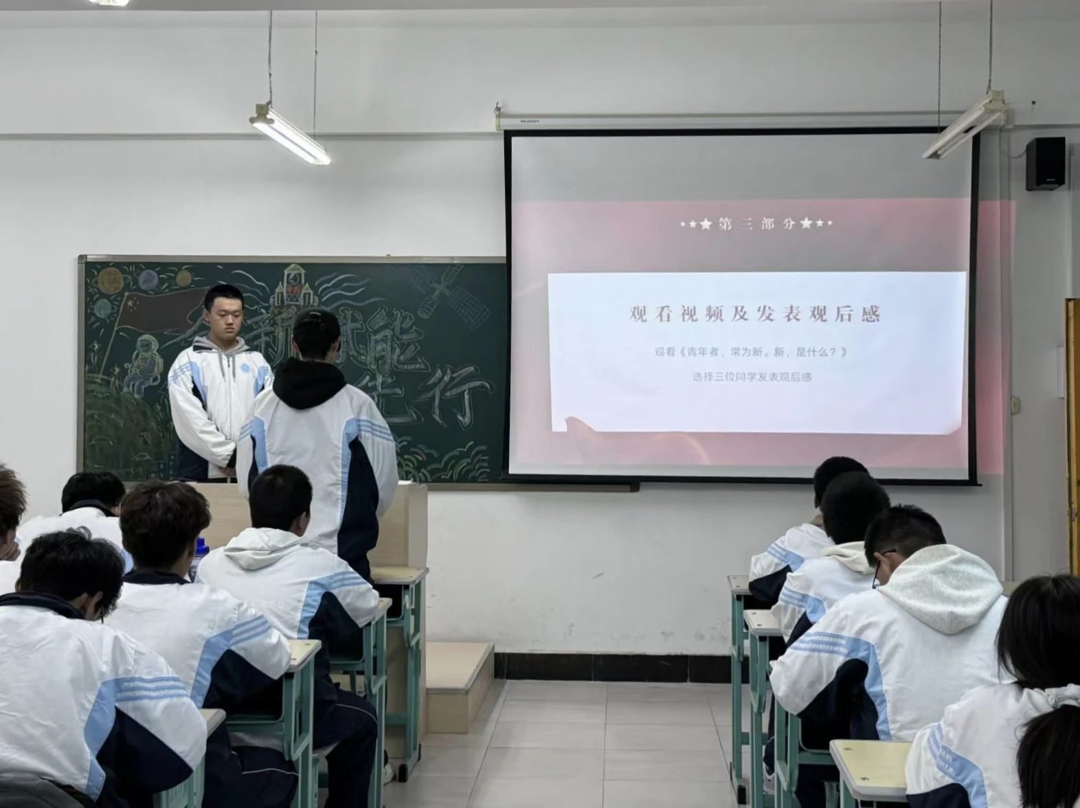 团会过程中,团支书为同学们讲述《习近平给中国国际老员工创新大赛参赛员工代表的回信》有关内容,以此来叮嘱同学们要敢于突破传统思维的束缚,敢于尝试新事物,不断探索新的发展道路。紧接着,团支书带领同学们观看视频《青年者,常为新。新,是什么?》,视频中谈到了创新的意义,青年应怎样创新等方面,使同学们了解创新对于国家的重要性,激发了同学们科技创新精神。观看视频后,同学们纷纷表示要树牢科技报国志,刻苦学习钻研,积极运用在课堂辛勤学到的丰富知识去切实解决实际问题,永攀科学高峰,在推进强国建设、民族复兴伟业中绽放青春光彩。