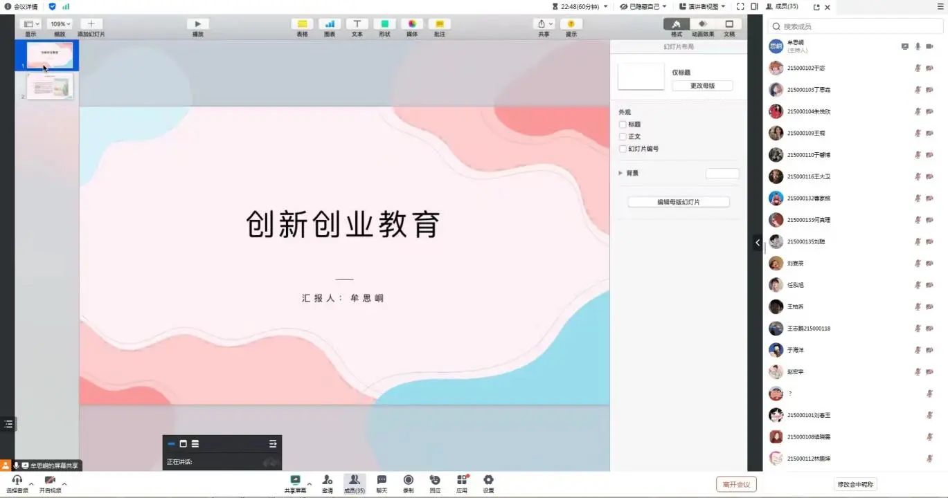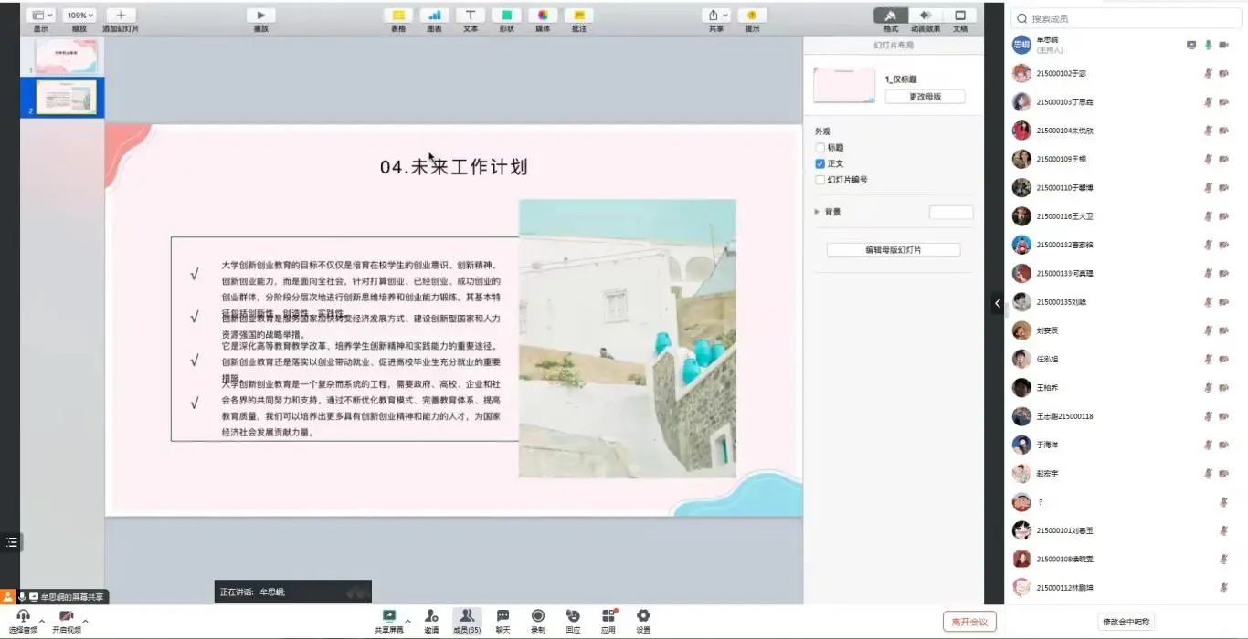 会议开始,牟思峒老师对创新创业的概念进行了解读,同学们对创新创业有了更加深刻的理解。随后,通过观看创新创业的成功案例视频,使同学们看到了创新创业的实际效果,进一步激发了他们的创新创业激情。在讨论环节中,同学们围绕“创新创业的重要性”、“如何提升创新创业能力”等话题展开了热烈的讨论,并积极发表自己的想法,升华对创新创业的认识。同学们纷纷表示对自己的未来充满期待,一定利用自己的专业知识,并通过创新创业实现自我价值。会议最后,牟思峒老师鼓励同学们通过运用成长型思维模式、提高心理灵活性等方法,不断提升自己的创业心智,为成功创业奠定坚实基础。同时希望同学们能多多丰富自己,明确未来目标,让双创这强有力的翅膀把同学们带向更广阔的天空。