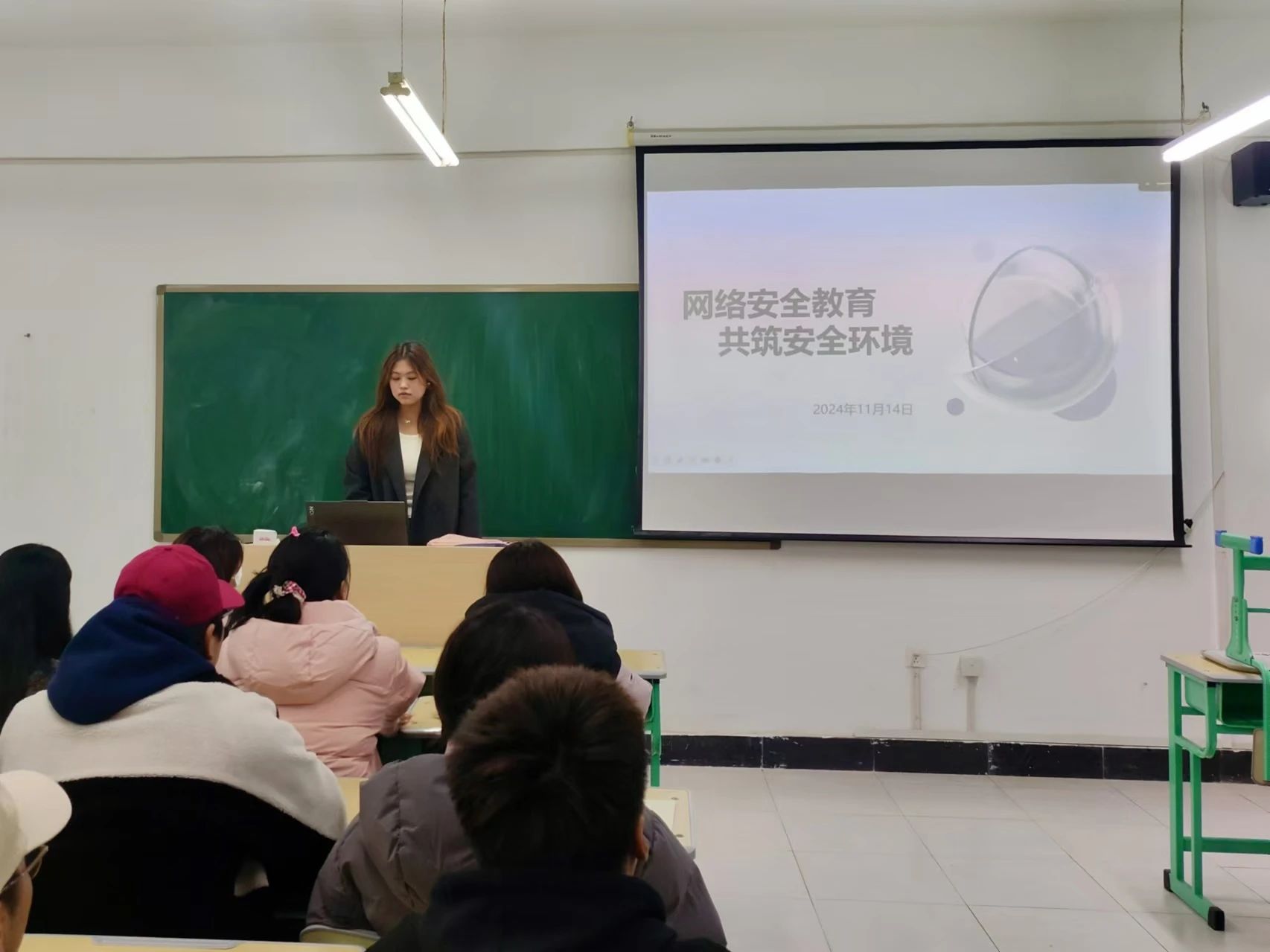 活动内容通过演示“网络安全教育,共筑安全环境”PPT的形式进行宣讲,并跟据相关案例让同学们认识到“网络安全教育及提升自我保护”的重要性。活动开始权益部工作人员向同学们介绍了网络安全方面的有关知识,如网络安全的概念以及其意义。
