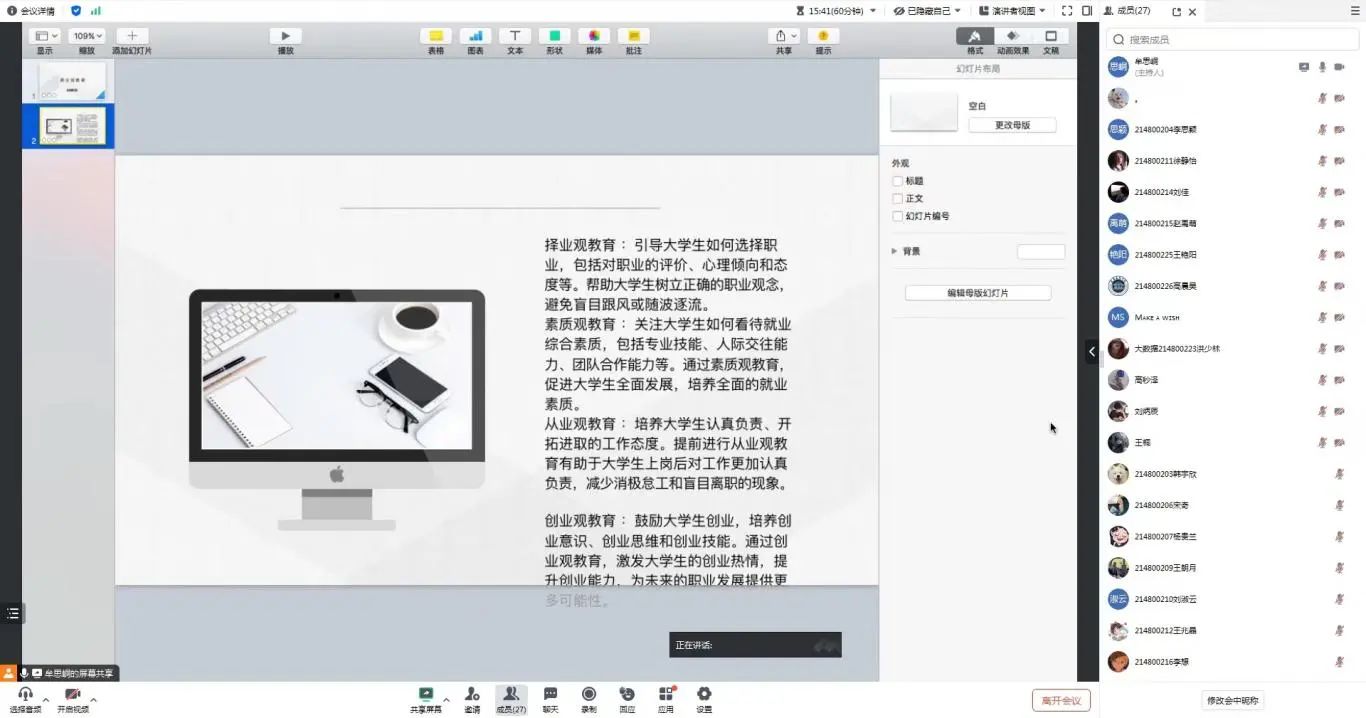 为帮助同学们更好地认清当前严峻的就业形势,调整就业心态,提升就业的意识,并提前做好就业准备。近日,ladbrokes立博2021级召开“就业观教育”主题班会。此次班会由公司辅导员牟思峒老师主持,2021级全体员工参与。