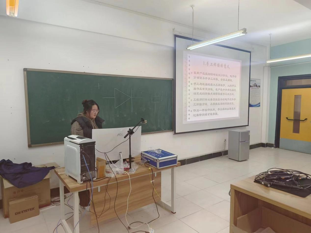首先高炜同学为同学们介绍了“DIY智能小车挑战赛”的赛制、规则、参赛要求等重要信息。让同学们对赛事的整体框架和要求有了清晰地认识,明确了努力的方向。随后,赵银君同学为同学们讲解了手工焊接的意义、焊接需要的工具以及材料的简介、焊接的机理、焊接五步法和常用电子元器件的简介。为同学们讲解了比赛中所需的主要技术问题以及解决问题的方法。