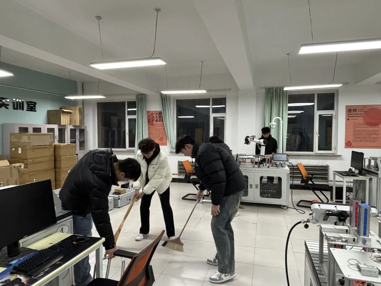活动开始,各部门精心组织人员安排,确保每个环节都紧密相扣。同学们满怀热情地奔赴各自的“岗位”,负责清扫的同学们不放过任何一个角落,认真清理地面灰尘和杂物,使展厅焕然一新;一丝不苟地擦拭实验仪器,确保仪器干净整洁,为后续实验教学的顺利开展提供了保障。清扫过程中,大家相互交流,分享劳动经验,不仅提高了工作效率,还增进了同学之间的友谊,展现出了极强的团队协作精神,帮助同学们在劳动中享受体育锻炼的乐趣,增强体质,塑造健全人格,锤炼坚韧意志。