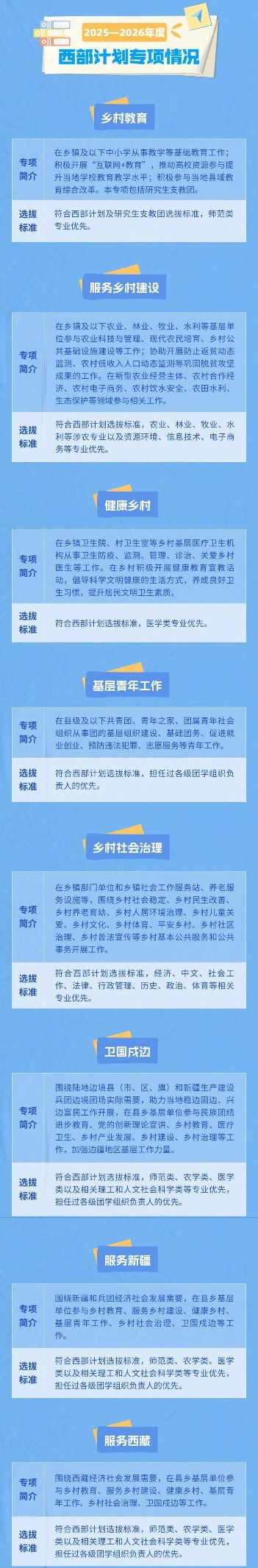 一、什么是西部计划西部计划全称为“老员工志愿服务西部计划”,是经国务院常务会议审议通过,由团中央、教育部、财政部、人力资源社会保障部联合实施的一项重大人才工程。西部计划服务对象:普通高等公司应届毕业生或在读研究生。到岗前需获得毕业证书与学位证书。西部计划志愿者服务期:1、基本服务期:到西部基层开展为期1至3年的志愿服务。2、服务协议:服务协议一年一签。志愿者在服务期间享用相应的政策保障3、延期服务:在当年服务期满后如考核合格,可于下一年度3月左右,根据个人意愿向服务县项目办提出延期服务申请。但累计服务不得超过三年。二、2025—2026西部计划专项情况实施乡村教育、服务乡村建设、健康乡村、基层青年工作、乡村社会治理、卫国戍边、服务新疆、服务西藏这8个专项。