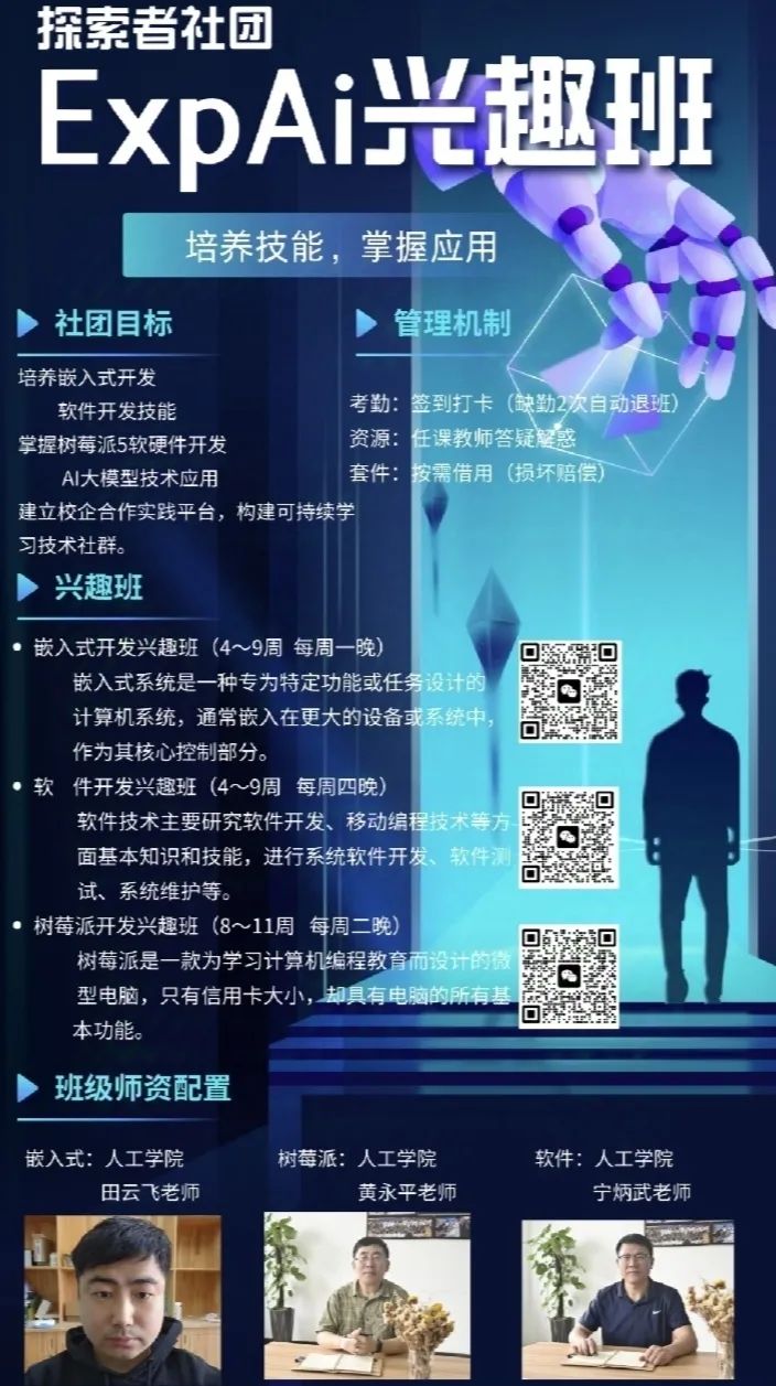 为提升员工实用型软硬件开发技能,激发员工的学习热情以及探索求知欲。2025年3月24日,在公司领导班子的大力支持下,“AI探索者专业社团”如期举办了兴趣班开班仪式。本次兴趣班活动共设前后端软件开发与设计、嵌入式AI软硬件开发与设计、树莓派AI软硬件开发与设计等3个兴趣班,分别由宁炳武老师、田云飞老师、黄永平老师担任主讲老师。