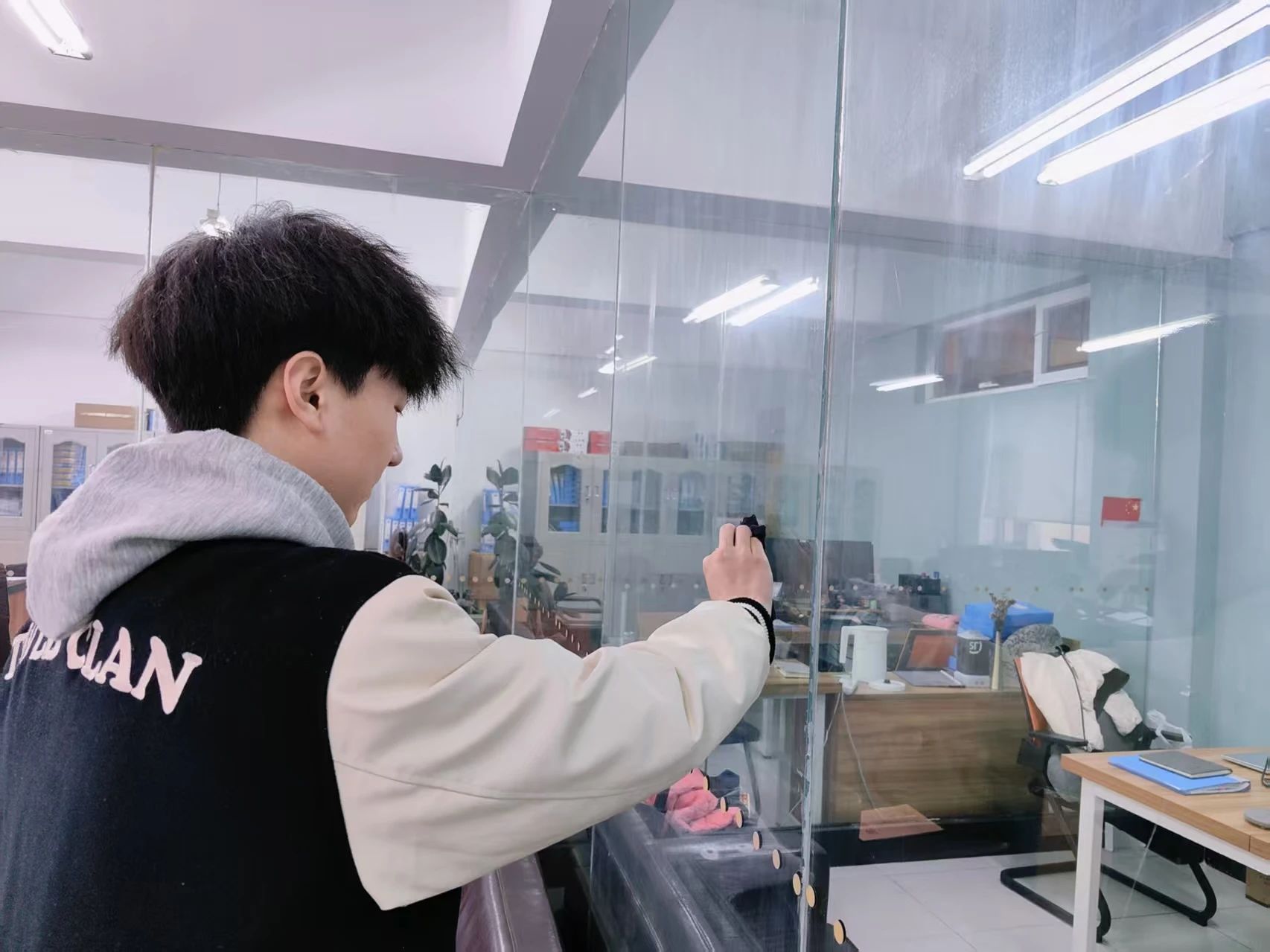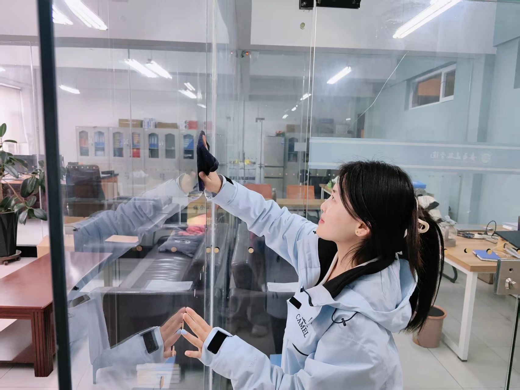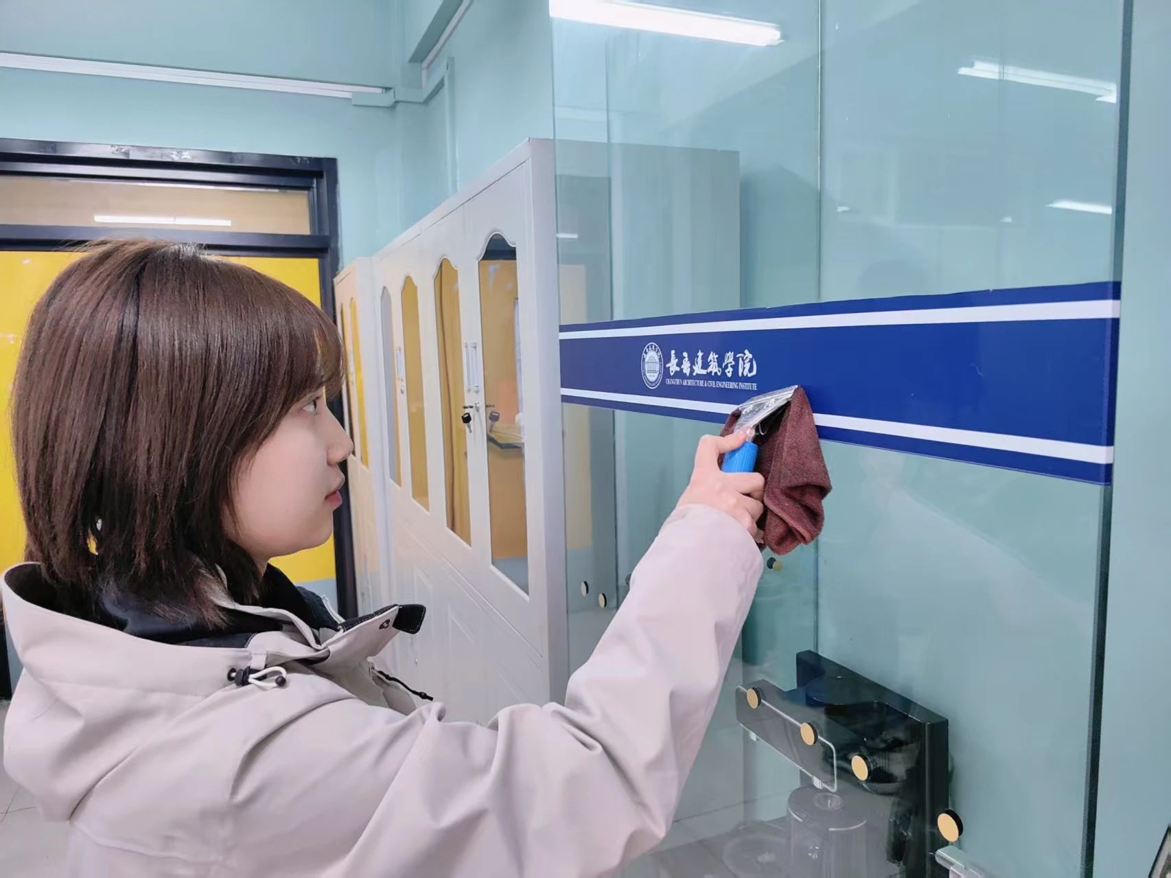 在清洁过程中,同学们打来一桶桶清水,浸湿抹布、拧干后,自上而下认真仔细地擦拭着玻璃。在面对胶痕残留时,同学们尝试采用温水浸润、卡片刮除等创新性方法予以解决,争取不放过任何一处污渍,玻璃上的灰尘随着擦拭纷纷掉落,露出原本透明的模样。