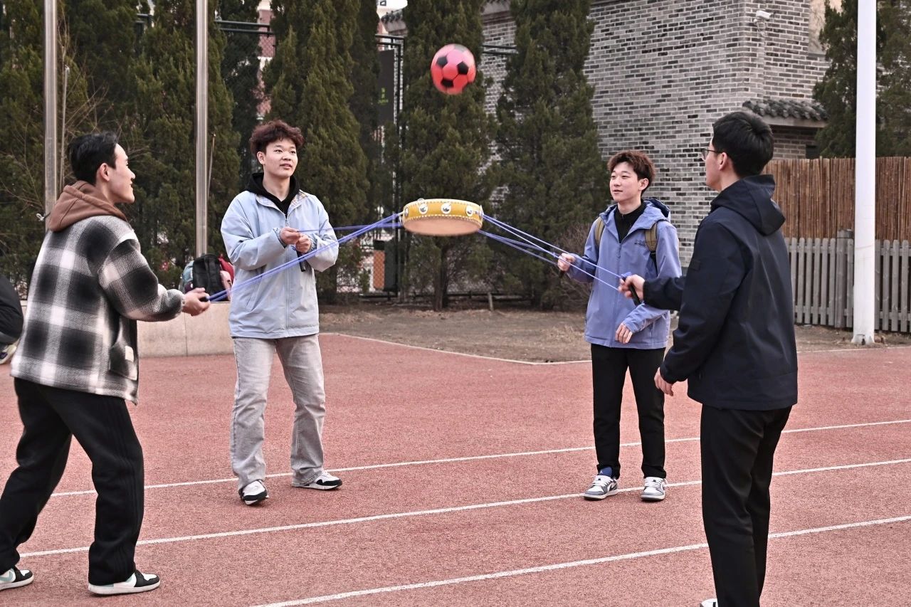 击鼓颠球:根据鼓的绳数确定具体人数。每位同学牵拉一根或两根鼓上的绳子,将鼓支撑起来,绳子必须拉直。颠球时,球连续颠起才计数,游戏过程中,鼓不得落地,球不得落在鼓面以外的地方。