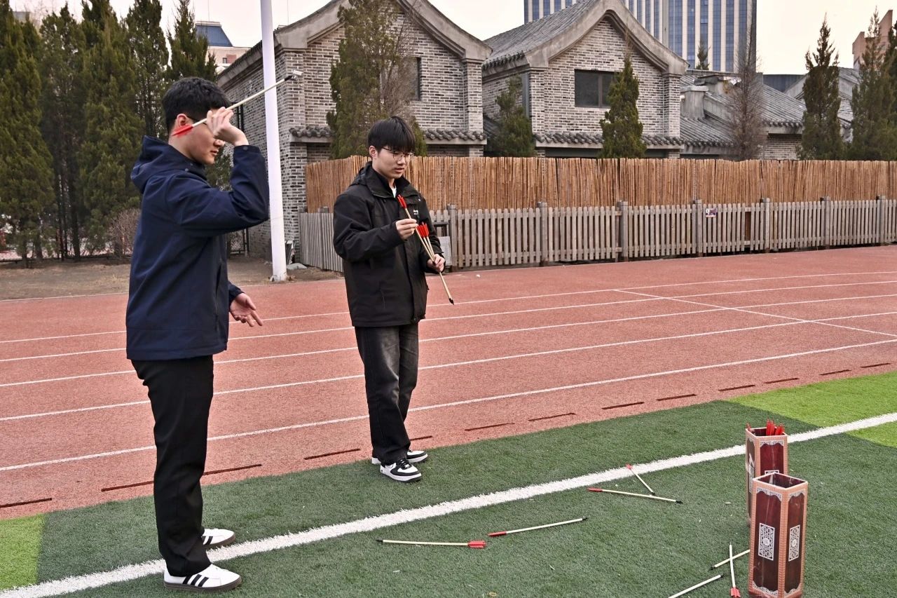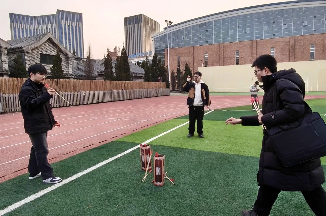 木箭投壶:参赛的同学站在投掷线后,手持箭矢,将箭矢投向壶中。箭矢必须首端先入壶中才算有效。参与者轮流投掷,不得抢投或连续投掷。在多人游戏中,可按照顺序从左向右(从右向左)依次投掷。每个同学手持相同数量的箭矢,投入最多的人赢得此轮游戏。