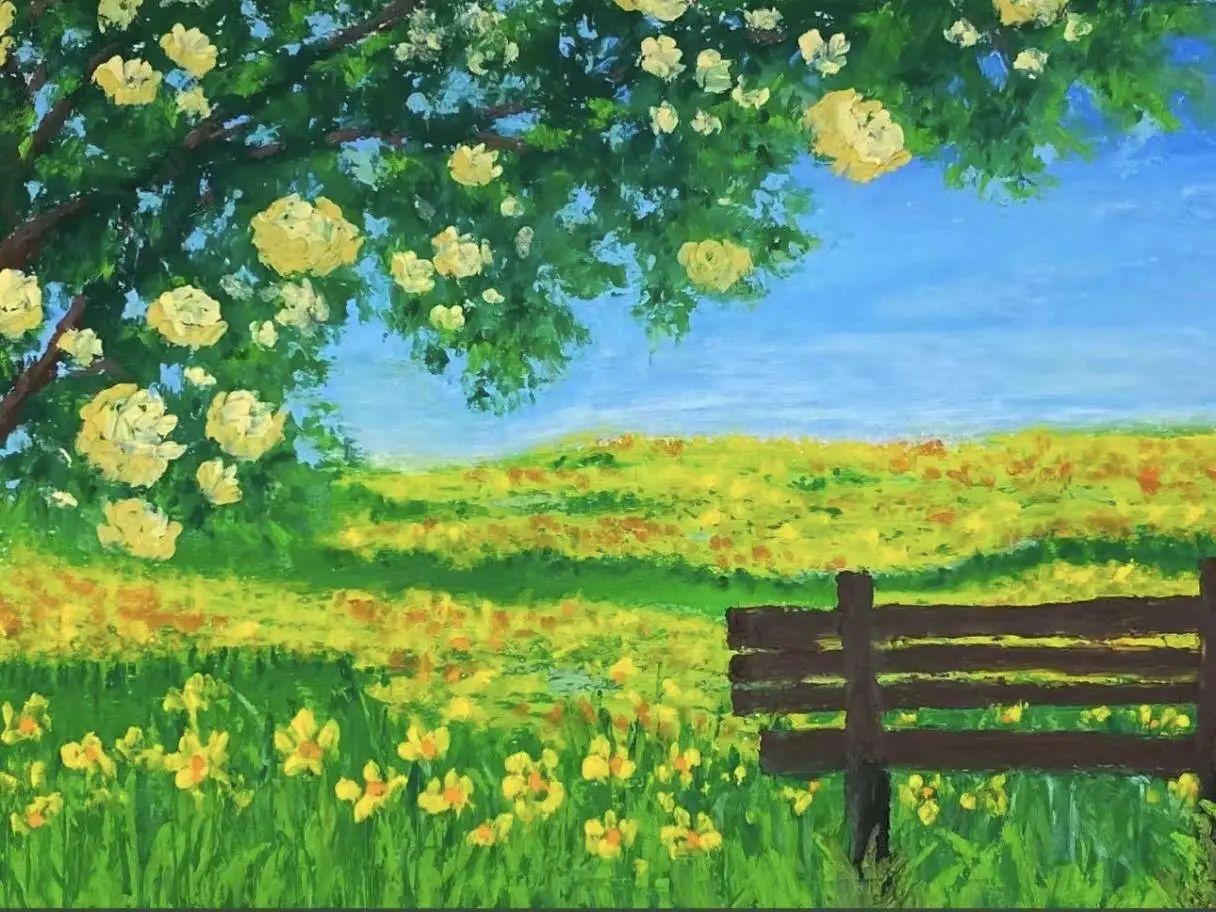 在同学们的笔下,春天在画布上徐徐展开。有的画里,嫩绿新芽迫不及待地从枝头探出脑袋,那一抹清新的绿,是春天最灵动的笔触;有的绘出大片金黄的油菜花田,微风轻拂,花浪翻涌,让人嗅到了春日田野的芬芳;还有的描绘了校园湖边垂柳依依,细长的柳枝垂落在水面,荡起圈圈涟漪,湖水倒映着湛蓝天空与洁白云朵,宛如梦幻仙境。每一幅画都是同学们眼中独特的春天,是他们对大自然细腻情感的抒发。