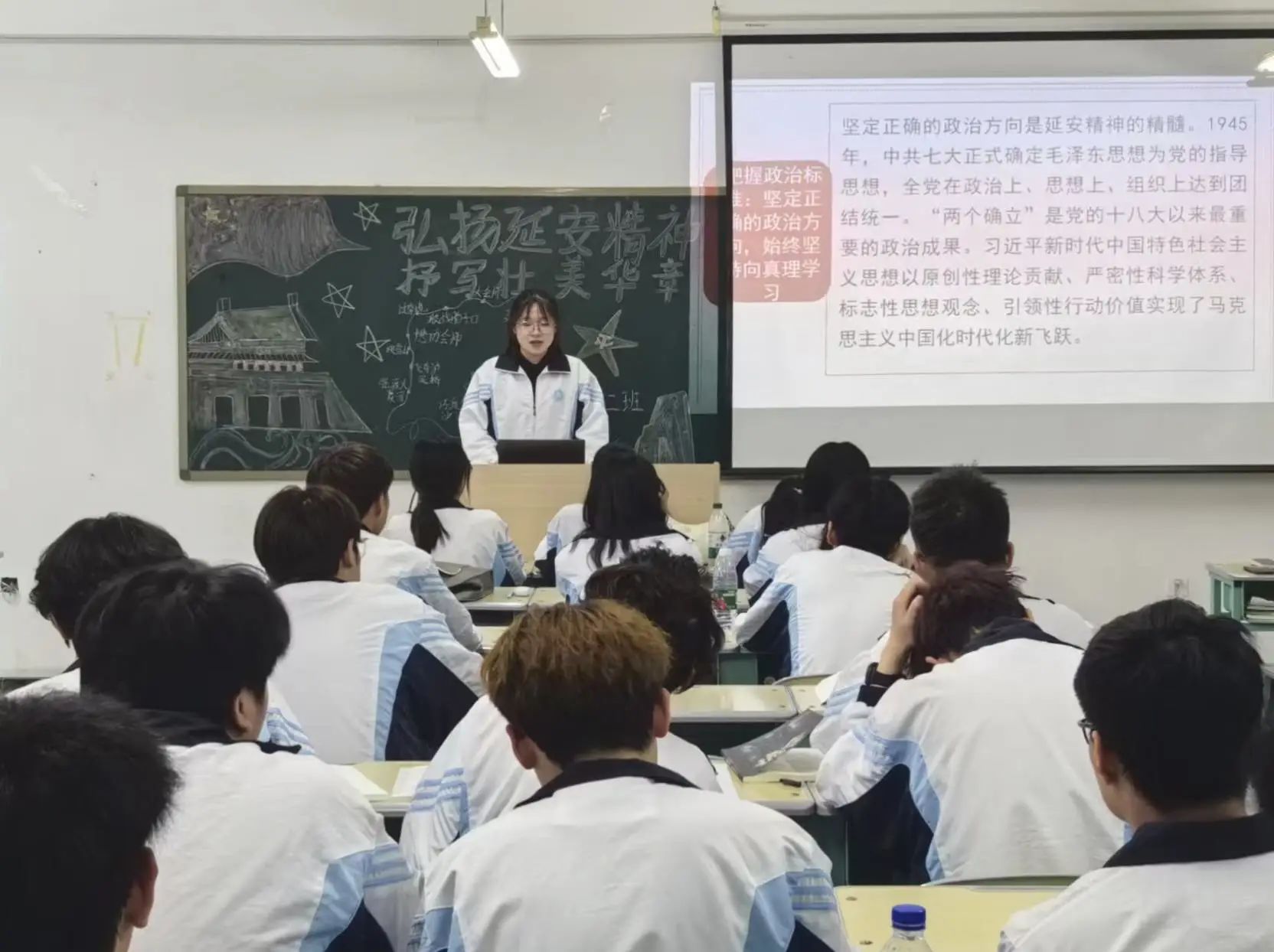 巍巍宝塔山,滚滚延河水。在这片孕育红色火种的土地上,诞生了影响深远的延安精神。各班团支书用自己精心准备的PPT为大家描述一幅延安精神的历史画卷。从1935年党中央抵达陕北,到1948年东渡黄河,详细讲述了延安精神形成的时代背景。“延安时期,中国共产党面临着军事围剿、物资匮乏等重重困难,但正是在这样的环境下,孕育出了‘坚定正确的政治方向,解放思想、实事求是的思想路线,全心全意为人民服务的根本宗旨,自力更生、艰苦奋斗的创业精神’的延安精神。”结合大生产运动中八路军战士“一手拿枪,一手拿镐”将南泥湾变成“陕北好江南”的故事,以及整风运动中党自我革新、追求真理的实践,同学们们深刻认识到延安精神是革命先辈用热血与智慧凝结而成的宝贵财富。有同学感慨:“在如此艰苦的条件下,八路军依然能保持思想的高度和战略的远见,实在是令人敬佩!”