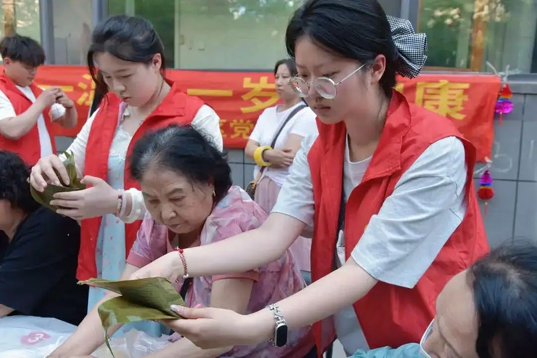 活动当天,阳光正好,微风不燥。同学们满怀期待与热情奔赴活动现场,那一张张朝气蓬勃的脸庞上写满了对这次活动的憧憬。社区早已精心准备好了糯米、红枣、粽叶等新鲜食材,一切准备就绪。工作人员细致讲解折粽叶成漏斗形、填糯米铺红枣、裹叶绑绳等包粽流程,同学们分组协作,一边帮老人淘米、捋粽叶,一边在指导下动手尝试,不一会儿,桌上就摆满了胖瘦不一、形态各异的粽子,有的歪歪扭扭却充满创意,有的棱角分明透着巧思,粽叶香气与欢笑声交织,勾勒出鲜活的端午图景。