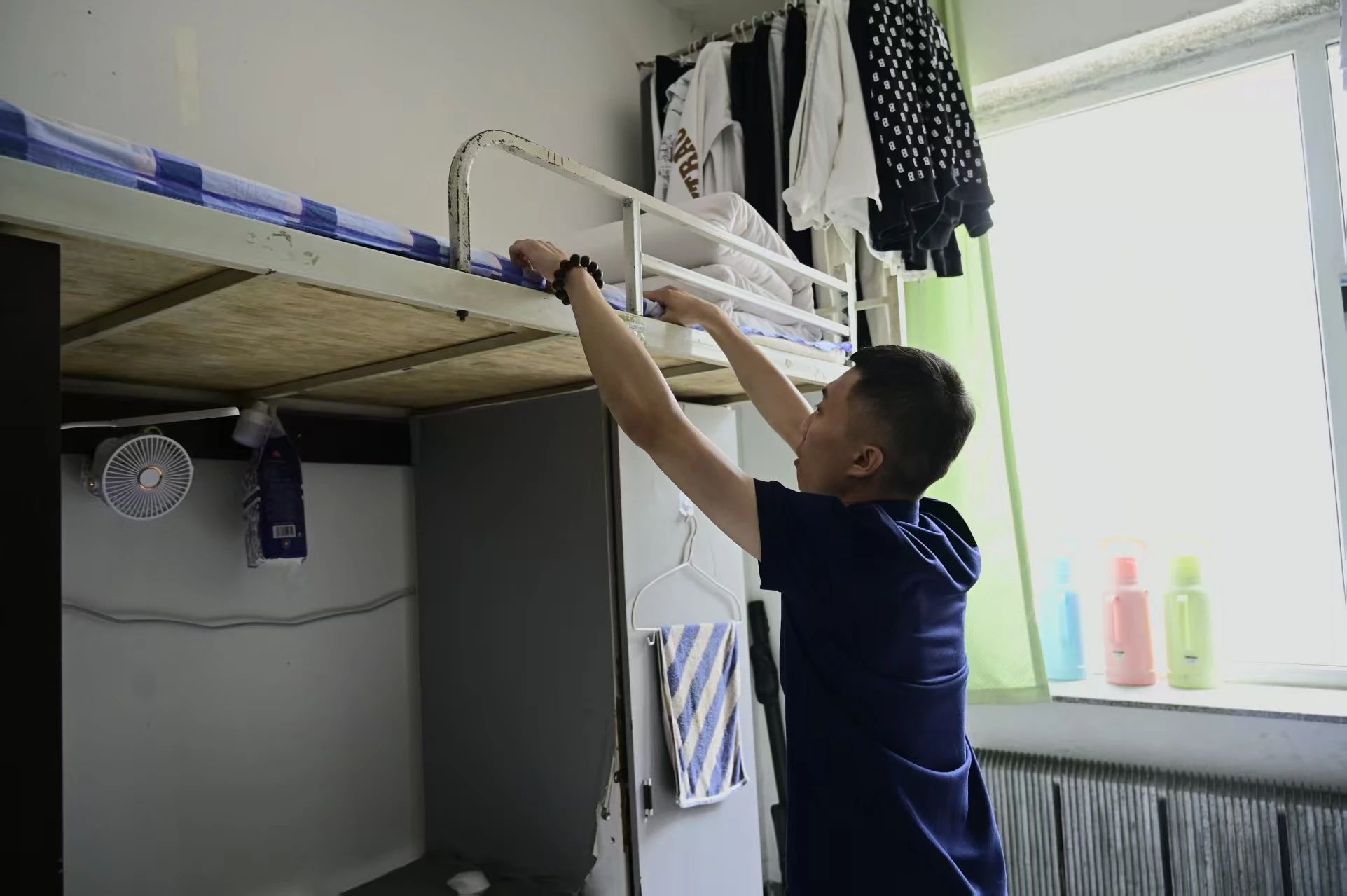 活动前期,各寝室在寝室长带领下迅速行动,成员间分工明确、配合有序,围绕卫生清洁展开讨论。有的针对窗台边、床梯下、衣柜顶部等易积灰的卫生死角,成立“死角攻坚小组”,使用除尘掸、清洁剂等工具进行深度清理,确保缝隙无蛛网、表面无污渍;有的对书桌、衣柜等储物空间实行“分类收纳作战”,按照“常用物品随手可及、闲置物品归置整齐”原则,用收纳盒、分层架对书本、衣物进行模块化整理,让桌面与柜体呈现“竖成线、横成面”的整洁效果。
