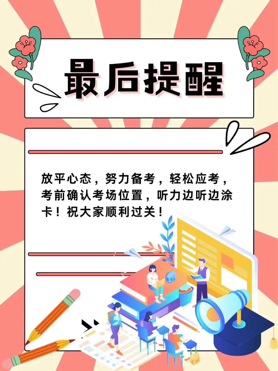 3、熟悉考场:有条件的同学提前去考场踩点,了解考场位置、周边环境和交通路线,计算好从住处到考场所需时间。考试当天提前出发,预留足够时间应对突发情况,避免迟到。